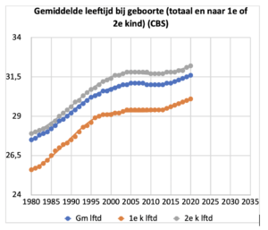 De gemiddelde leeftijd bij geboorte steeg in Nederland tussen 1980 en 2005 met 3,6 jaar van 27,5 jaar in 1980 naar 31,1 jaar in 2005. Hun eerste kind kregen NL moeders in 2005 met 29,4 jaar dus bijna 4 (3,8) jaar later dan in 1980 (toen: met 25,6 jaar). Tussen 2005 en 2015 bleven die gemiddelde leeftijden ongeveer hetzelfde om recent (na 2015) weer verder te stijgen. Trekken we die trend door naar 2035 dan zou de gemiddelde leeftijd bij geboorte in 2035 nog ruim 1,5 jaar hoger komen te liggen.