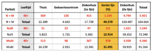 Ongeveer een kwart van de 40+ moeders in Perined bevalt in de eerste lijn en daarvan word de helft thuis geboren (550-600 per jaar). Het gaat in de eerste lijn bij 90% van de 40+ moeders die daar bevallen om een tweede of later kind. Oudere nulli baren voor meer dan 90% in het ziekenhuis. In de eerste lijn zijn dat er rond 120, waarvan 50 thuis.