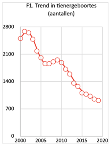 Vanaf het jaar 2000 is het absolute aantal tienergeboortes in Nederland in twee fasens sterk gedaald (Figuur F1). Er was eerst sprake van een daling tussen 200 en 2006 van rond 2700 naar rond 1900 tienergeboortes per jaar, gevolgd door een lichte toename tot 2010. Daarna zette een tweede sterke daling door vanaf het jaar 2010. Van 2000 gevallen in 2010 daalde het aantal tot rond 900 in 2019.