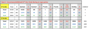 Er worden volgens de getallen in tabel 2 en tabel 3 tijdens de baring nog 34.400 zwangeren (45%) overgedragen van de eerste lijn naar de tweede lijn. Het gaat dan om rond 23.000 nulli (66%) en 11.400 multi (33%). Het risico om tussen het begin en het eind van de baring te worden overgedragen is dus bij nulli twee keer zo groot als bij multi. Deze 34.400 durante partu overdrachten gaan volgens deze cijfers gepaard met ruim 3400 secundaire sectio’s (10%) en 5200 kunstverlossingen (15%).